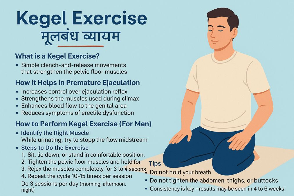 - कीगल एक्सरसाइज (Kegel Exercises – Pelvic Floor Exercises): ये पेल्विक फ्लोर की मांसपेशियों को मजबूत करती हैं, जो स्खलन को नियंत्रित करने में महत्वपूर्ण भूमिका निभाती हैं ।