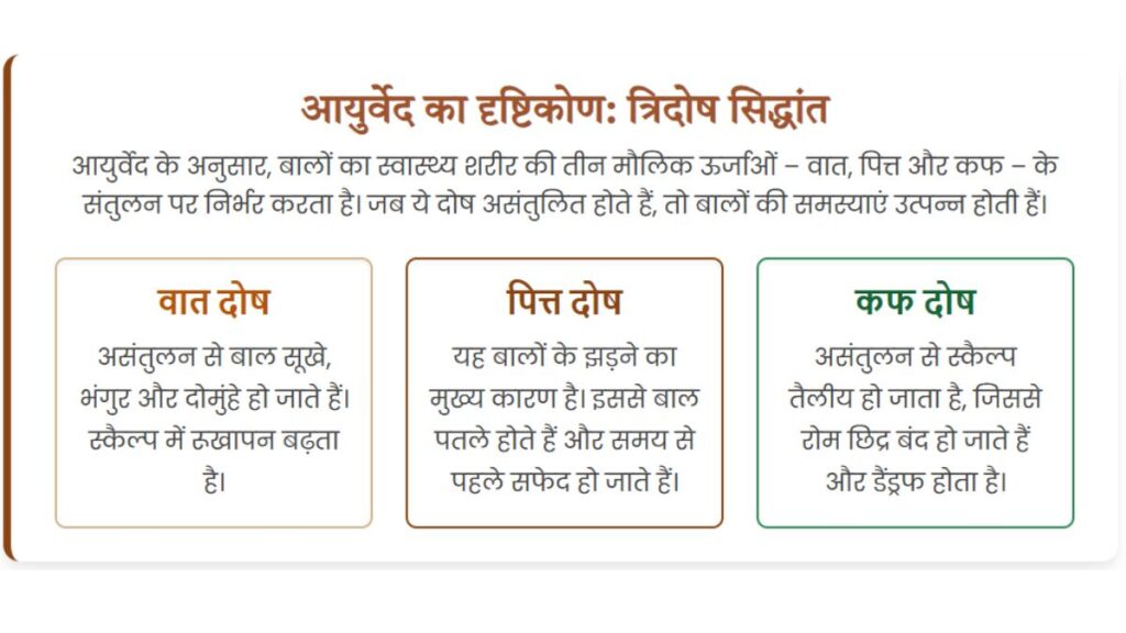 आयुर्वेद में, प्रत्येक व्यक्ति की शारीरिक और मानसिक प्रकृति वात, पित्त और कफ नामक तीन दोषों के संतुलन पर निर्भर करती है । बालों का स्वास्थ्य भी इन दोषों के संतुलन से प्रभावित होता है। गंजेपन की समस्या में आमतौर पर त्रिदोष असंतुलन देखा जाता है, जिसमें पित्त दोष की प्रमुखता होती है ।