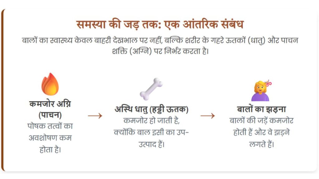 आयुर्वेद के अनुसार, बालों को अस्थि धातु (हड्डी ऊतक) का उपधातु (by-product) माना जाता है । यह एक महत्वपूर्ण अवधारणा है, जिसका अर्थ है कि बालों के स्वास्थ्य का सीधा संबंध हड्डियों के स्वास्थ्य से है। इसलिए, अस्थि धातु की कमजोरी सीधे बालों के स्वास्थ्य को प्रभावित कर सकती है, जिससे बाल झड़ना, कमजोर होना और टूटना जैसी समस्याएं होती हैं । अस्थि धातु में कमी के लक्षणों में हड्डियों और जोड़ों में दर्द, दांतों व नाखूनों का टूटना और रूखापन, तथा बालों और दाढ़ी के बालों का झड़ना शामिल है ।