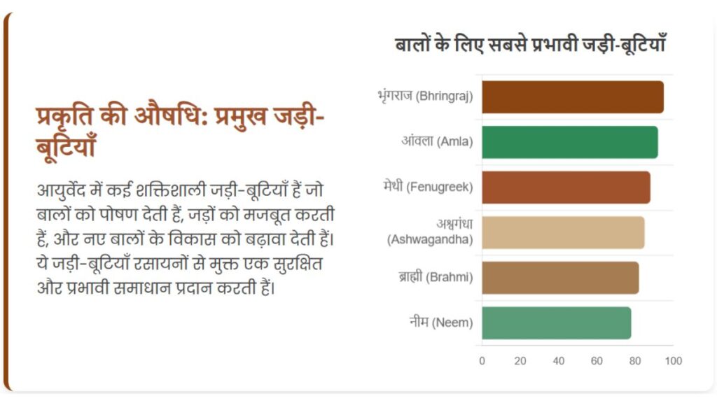 आयुर्वेद में बालों के विकास को बढ़ावा देने और गंजेपन को दूर करने के लिए कई शक्तिशाली जड़ी-बूटियों और प्राकृतिक सामग्रियों का उपयोग किया जाता है। ये सामग्रियां न केवल बालों को बाहरी पोषण प्रदान करती हैं, बल्कि आंतरिक संतुलन को भी सुधारती हैं।