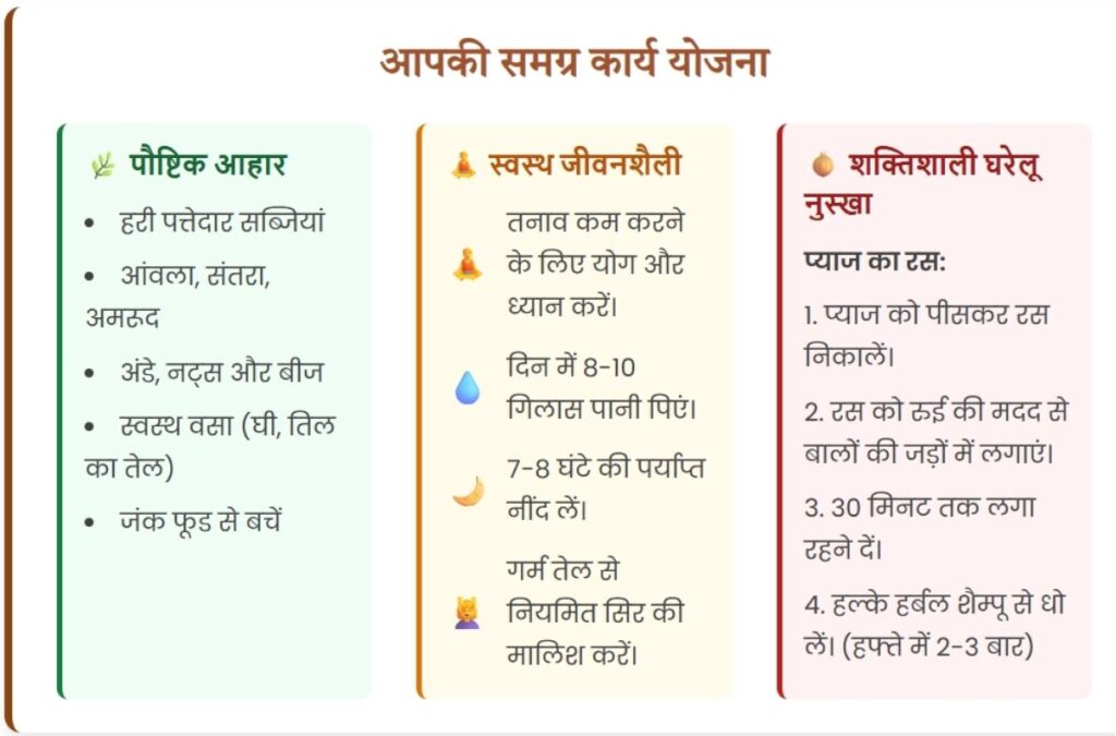 आहार के साथ-साथ, एक स्वस्थ जीवनशैली भी बालों के झड़ने को रोकने और नए बालों के विकास को बढ़ावा देने में महत्वपूर्ण भूमिका निभाती है ।