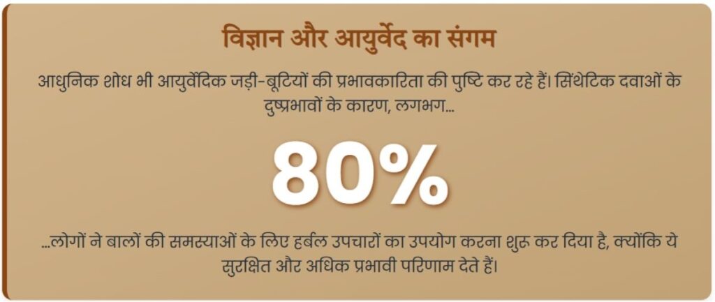 आधुनिक वैज्ञानिक शोध भी पारंपरिक आयुर्वेदिक दावों का समर्थन कर रहे हैं। भृंगराज और आंवला जैसी जड़ी-बूटियों पर किए गए नैदानिक अध्ययनों ने बालों के विकास को बढ़ावा देने और बालों का झड़ना कम करने में उनकी प्रभावशीलता को दर्शाया है। कुछ अध्ययनों ने तो समग्र आयुर्वेदिक उपचार पद्धतियों को पारंपरिक एलोपैथिक उपचारों की तुलना में अधिक प्रभावी पाया है, विशेषकर एंड्रोजेनिक एलोपेसिया के मामलों में। यह बढ़ती हुई वैज्ञानिक मान्यता आयुर्वेदिक उपचारों को गंजेपन के लिए एक सुरक्षित और प्रभावी विकल्प के रूप में स्थापित करती है, जिसमें रासायनिक उपचारों की तुलना में कम दुष्प्रभाव होते हैं।